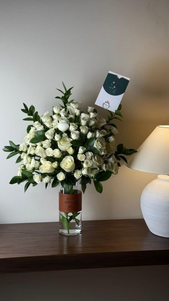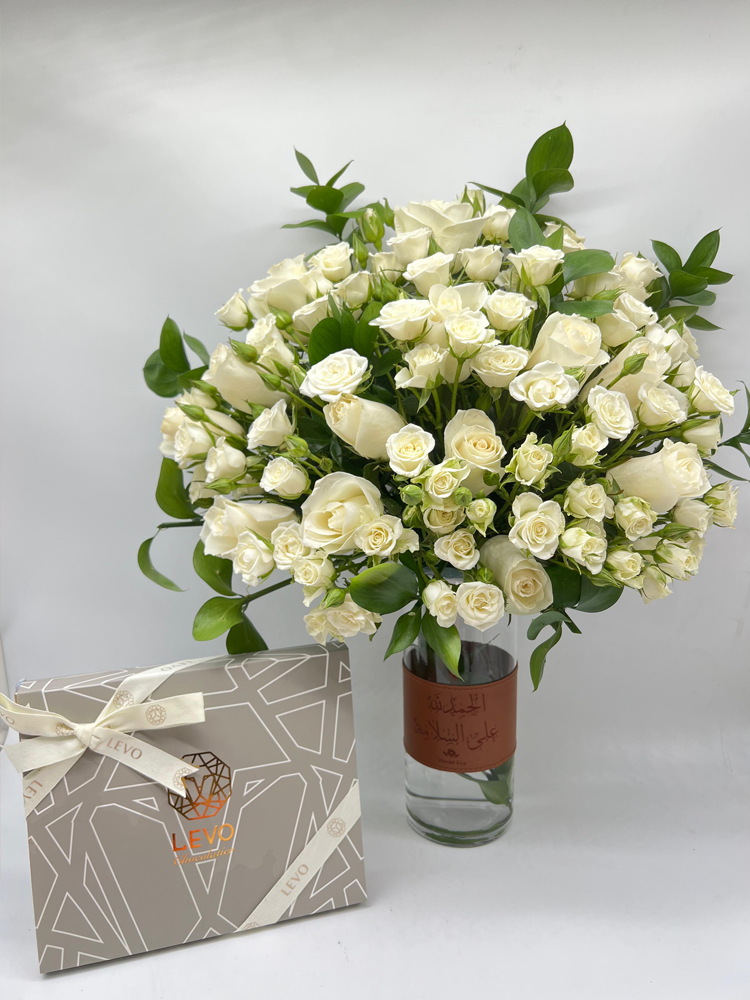 تنسيق فاخر من الورد الأبيض الفخم مع لمسات من الخضار الناعم، في فازة كريستالية أنيقة مع جلد محفور بالحمدلله على السلامة، مرفق معها علبة شوكولاتة من ليڤو بتغليف راقٍ.