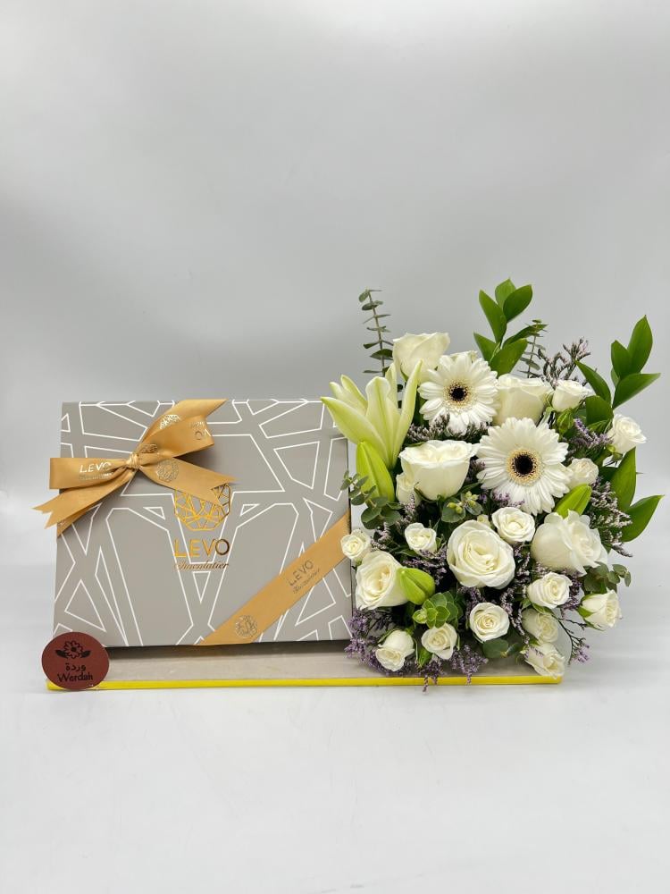 قاعدة تنسيقة ورد أنيقة وفاخرة بدرجات الأبيض الهادئة، تأتي مع بوكس شوكولاتة فاخر من Levo. تحتوي على توليفة مميزة من الورود البيضاء، الجيربيرا، والليلي، مع لمسات من الزهور البنفسجية الدقيقة وأوراق خضراء طبيعية تعزز جمال التنسيق.