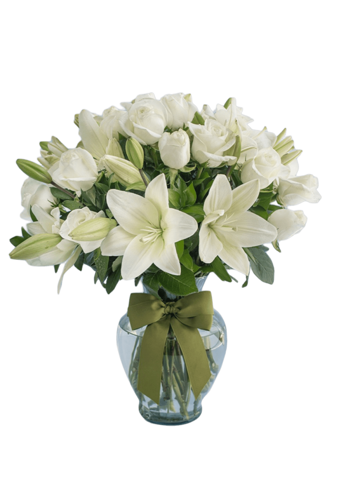 زهور الفاخرة تتضمن مزيج من ورود بيضاء مع ليليوم ابيض و أوراق الشجر مشكلة ذات الرائحة الجميلة .