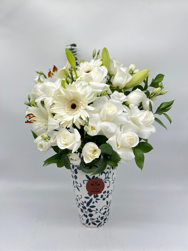 * فازة فخمة تجمع بين البياض النقي وأناقة السيراميك المزين بنقوش زرقاء كلاسيكية. تنسيق ورد أبيض فاخر يعكس الصفاء والرقي في كل تفاصيله. مثالية للمناسبات الراقية أو كهديّة تعبّر عن نقاء المشاعر.