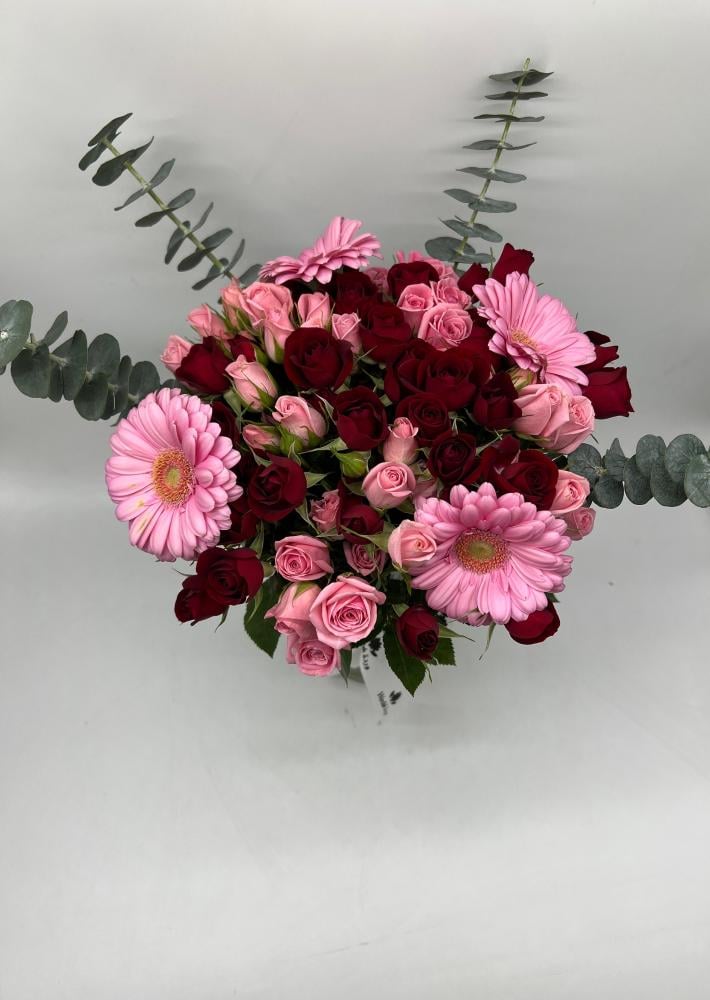 باقة أنيقة تنبض بالحب والرقي، بتوليفة من الورود الحمراء والوردية الناعمة مع لمسة من الجيربيرا الوردية المنعشة وأوراق الأوكالبتوس الخضراء، منسقة بفازة زجاجية وشريط أنيق من وردة. مثالية للإهداء في المناسبات العاطفية أو كلمسة شكر دافئة.